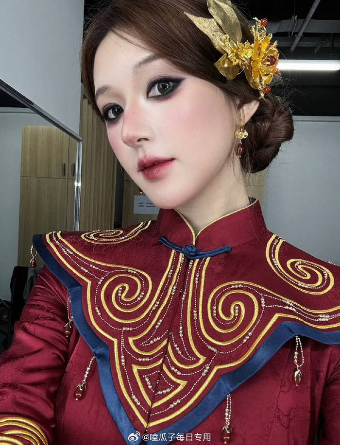 这次造型到底有多绝?看看这红与白的极致碰撞就知道了。赵露思身上那件正红色嫁衣,不是新娘该有的明媚鲜活,反而透着一股沉淀多年的腐朽感,领口袖口的暗纹在阴影里若隐若现,像极了被岁月浸染的阴气。更绝的是她那张惨白的脸,底妆薄得像纸人,一点血色都没有,偏偏唇色是暗到发黑的猩红,活脱脱凝固的血珠。有游戏迷直接扒出对比图,说这造型和《红嫁衣:纸新娘》里的邪灵角色简直一模一样,连眼尾那抹上扬的深色眼影都复刻得丝毫不差。